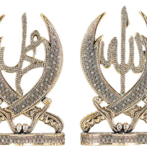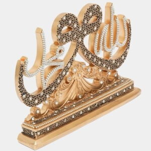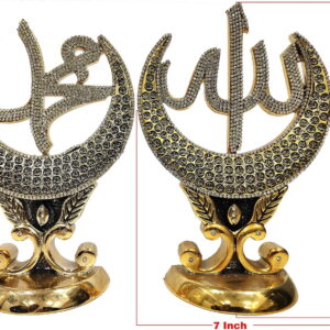Allah and Mohammed (saw) stand comes encrusted with crystals. This beautiful home decoration comes in Gold Size: Height 27cm Width