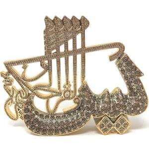 A beautiful set of golden sculptures shaped in the Arabic calligraphy for ‘Allah’ and ‘Muhammad’ accented with crystal rhinestone. Material: