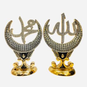 Allah and Mohammed (saw) stand comes encrusted with crystals. This beautiful home decoration comes in Gold Size: Height 27cm Width