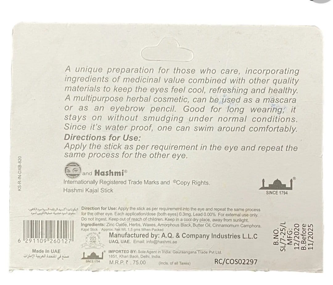 Hashmi Kajal Stick has a unique formulation that is designed to enhance the beauty of your eyes. It contains a perfect combination of medicinal and other high-quality ingredients that keep the eyes cool, hydrated, and healthy