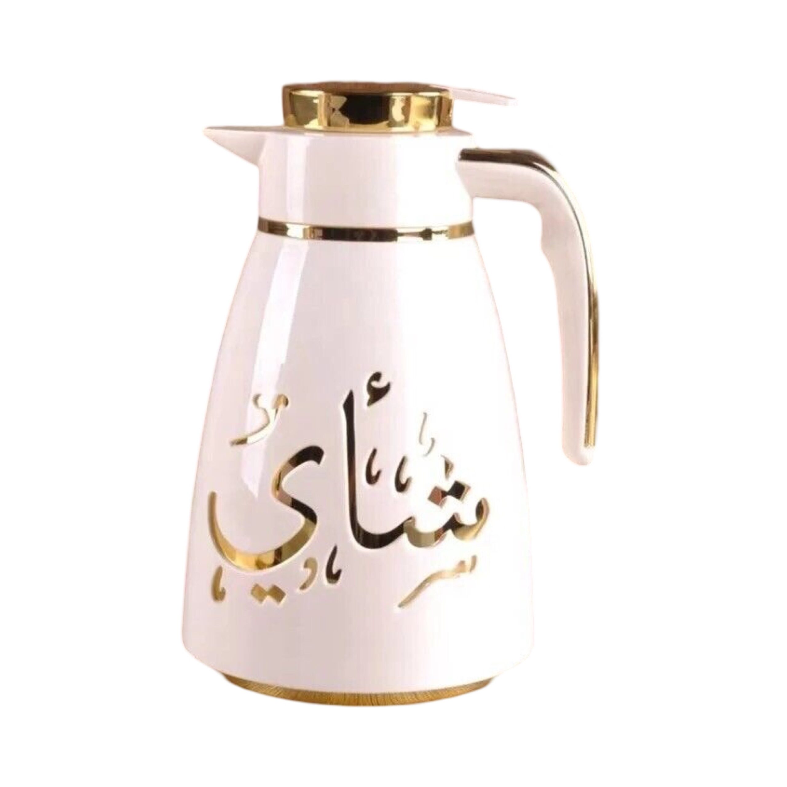 Ejshe tea vacuum flask. White and gold. Keeps hot or cold. 1 liter.