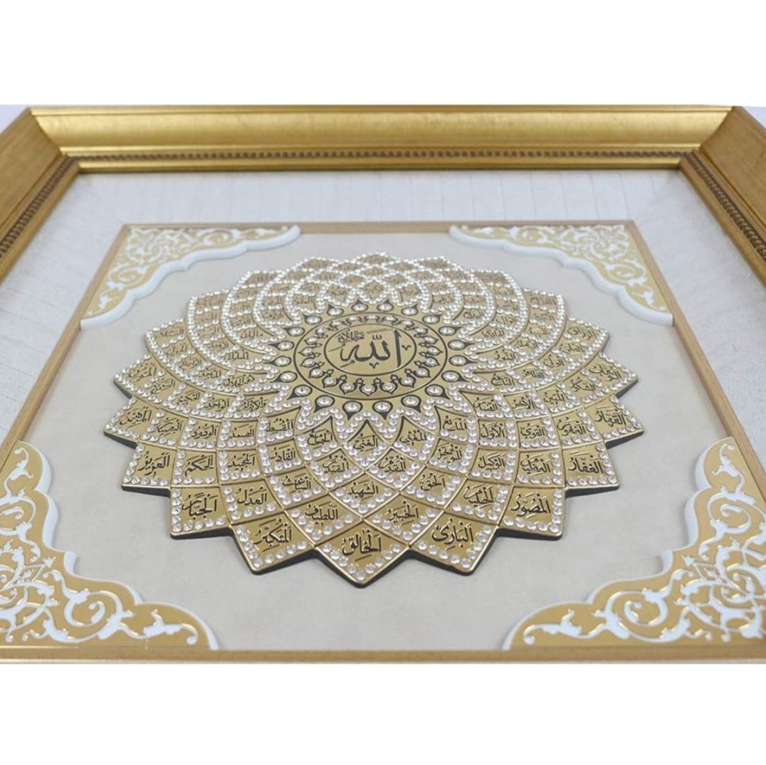 Elegantly presents the 99 names of Allah in a daisy pattern accented with rhinestones, rounded off by a stunning square frame