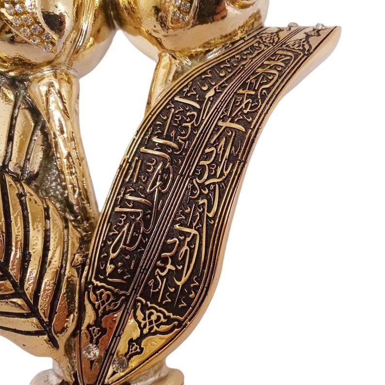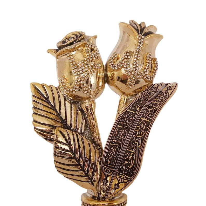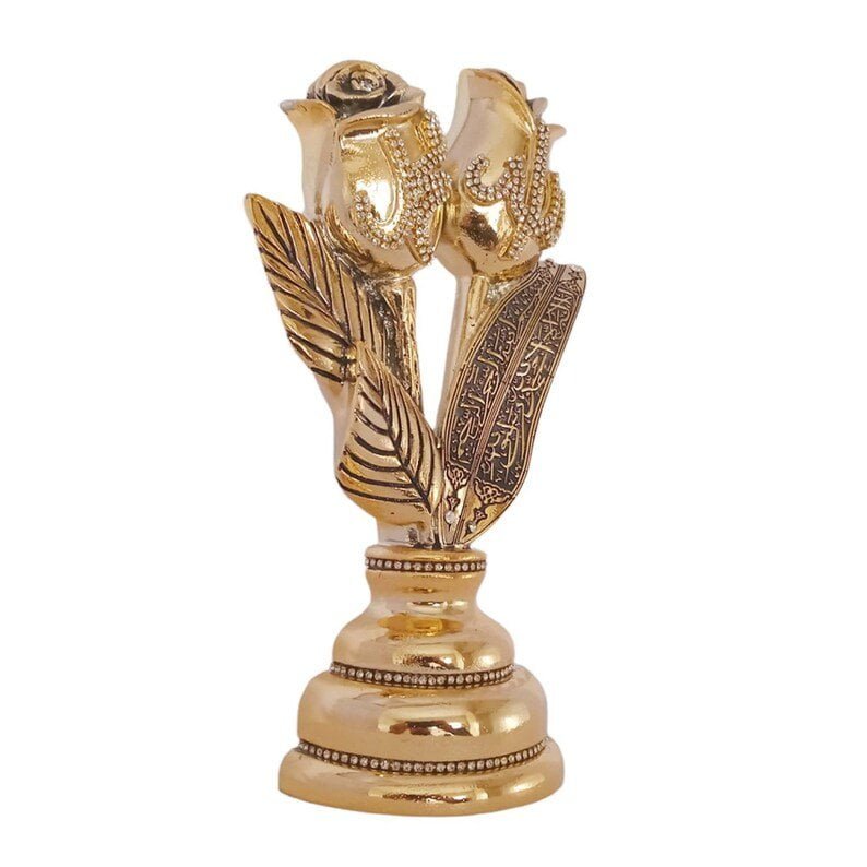 A beautiful golden cone sculpture engraved with the 99 names of Allah accented with crystal rhinestones Green, Red, Blue, Turquoise