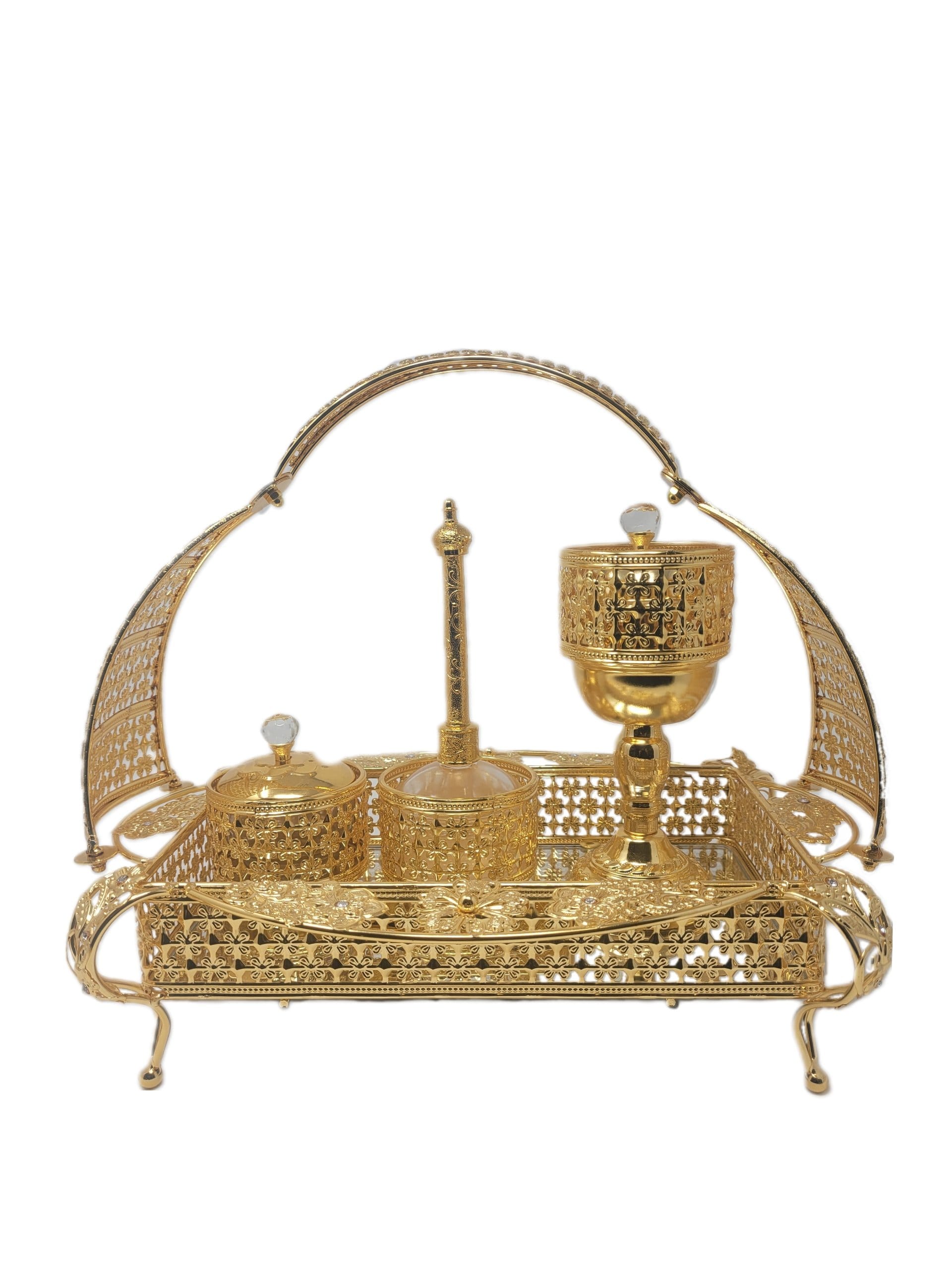 Gold glass containers for bakhoor and fragrance oil with tray.