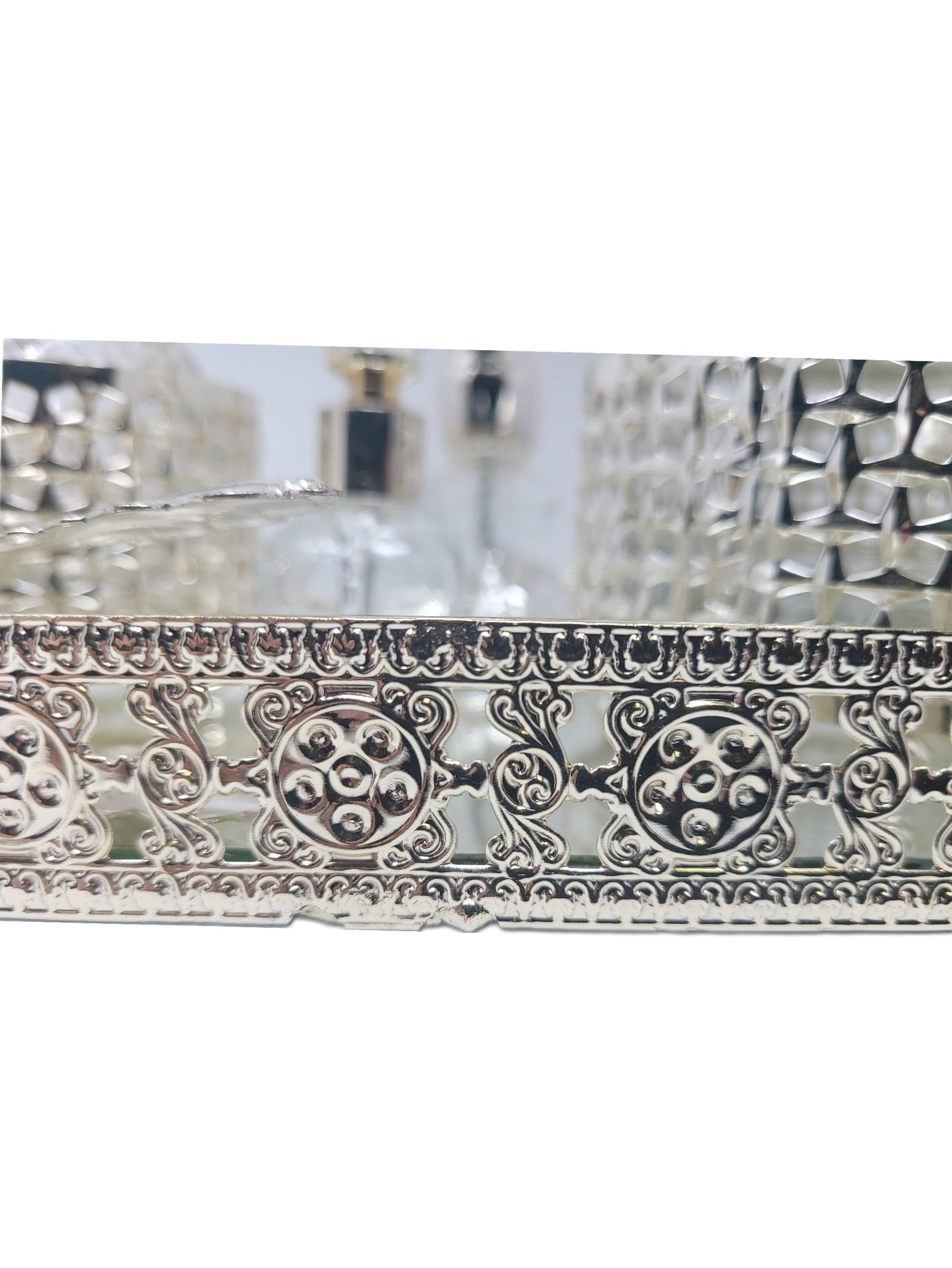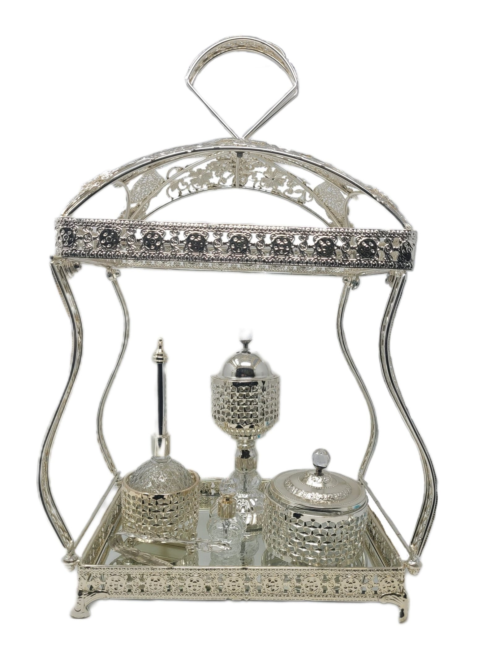 Silver glass containers for bukhoor and fragrance oil with tray.