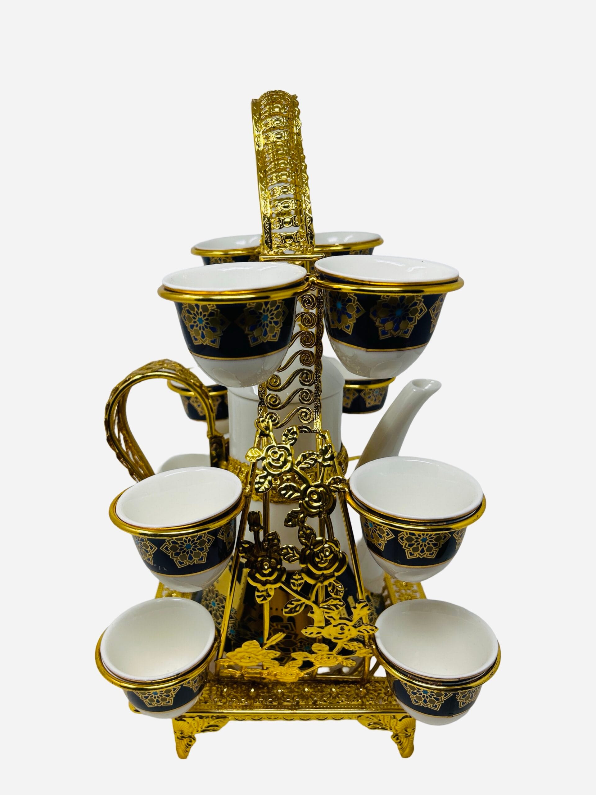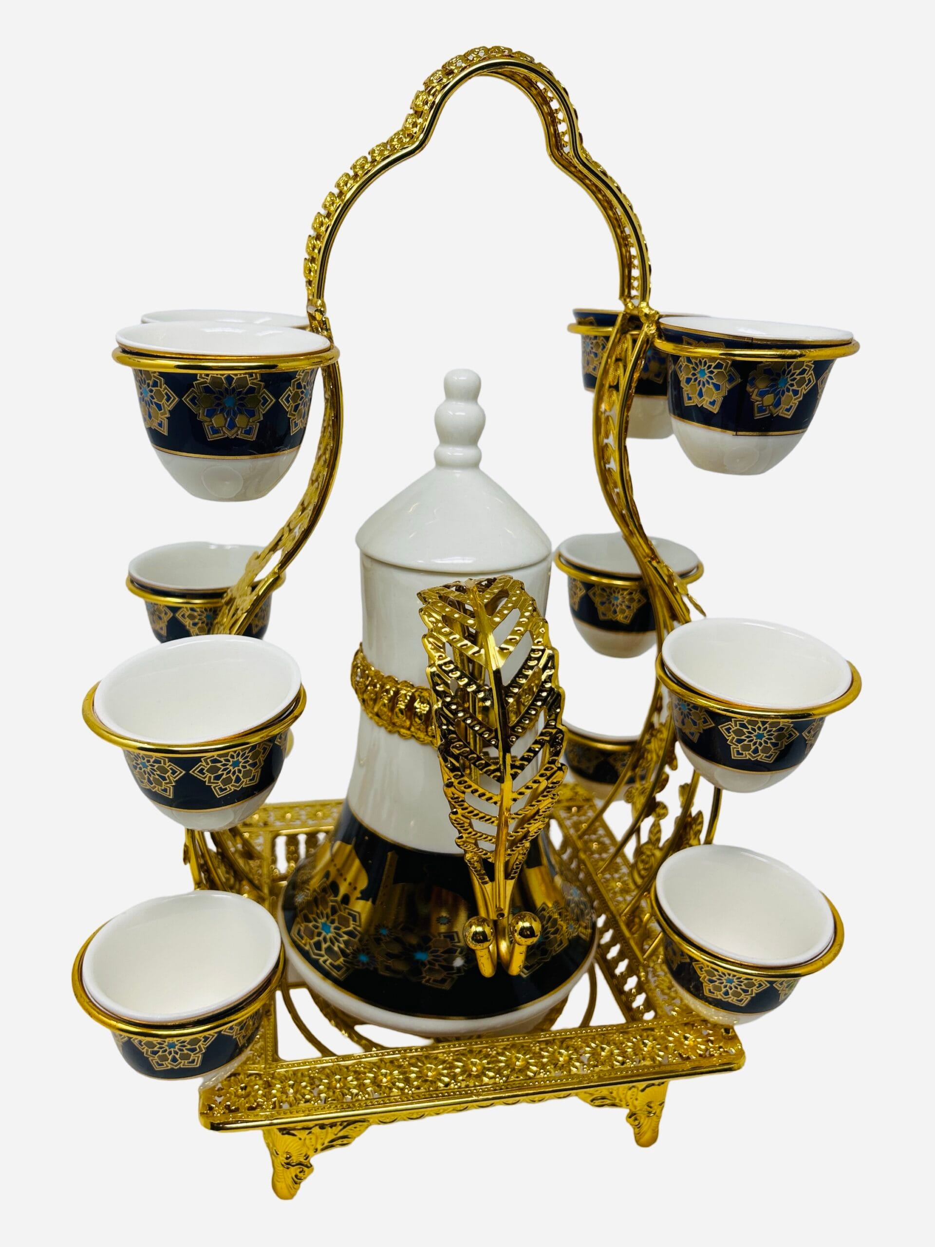 White and navy blue Glass Jug , 12 cups for Arabic coffee , and golden Section Serving