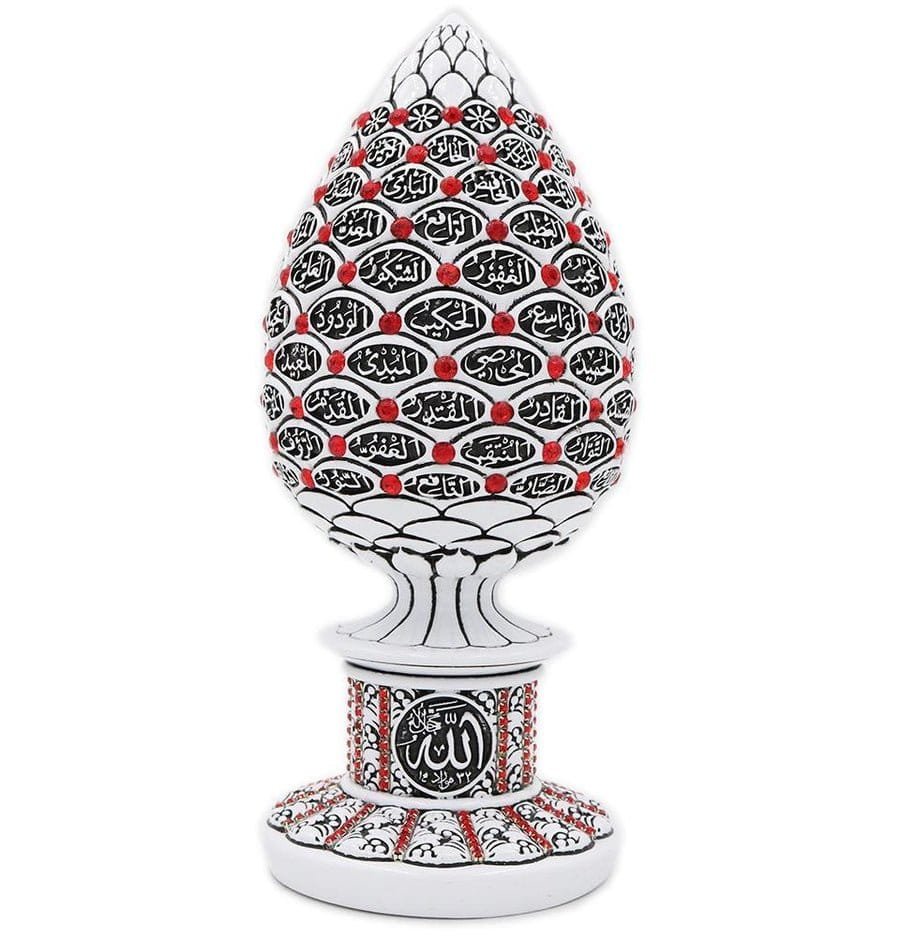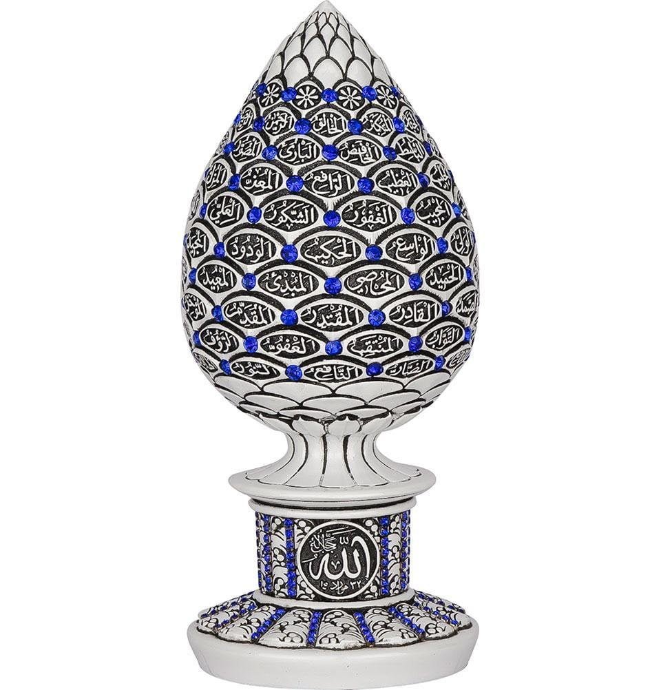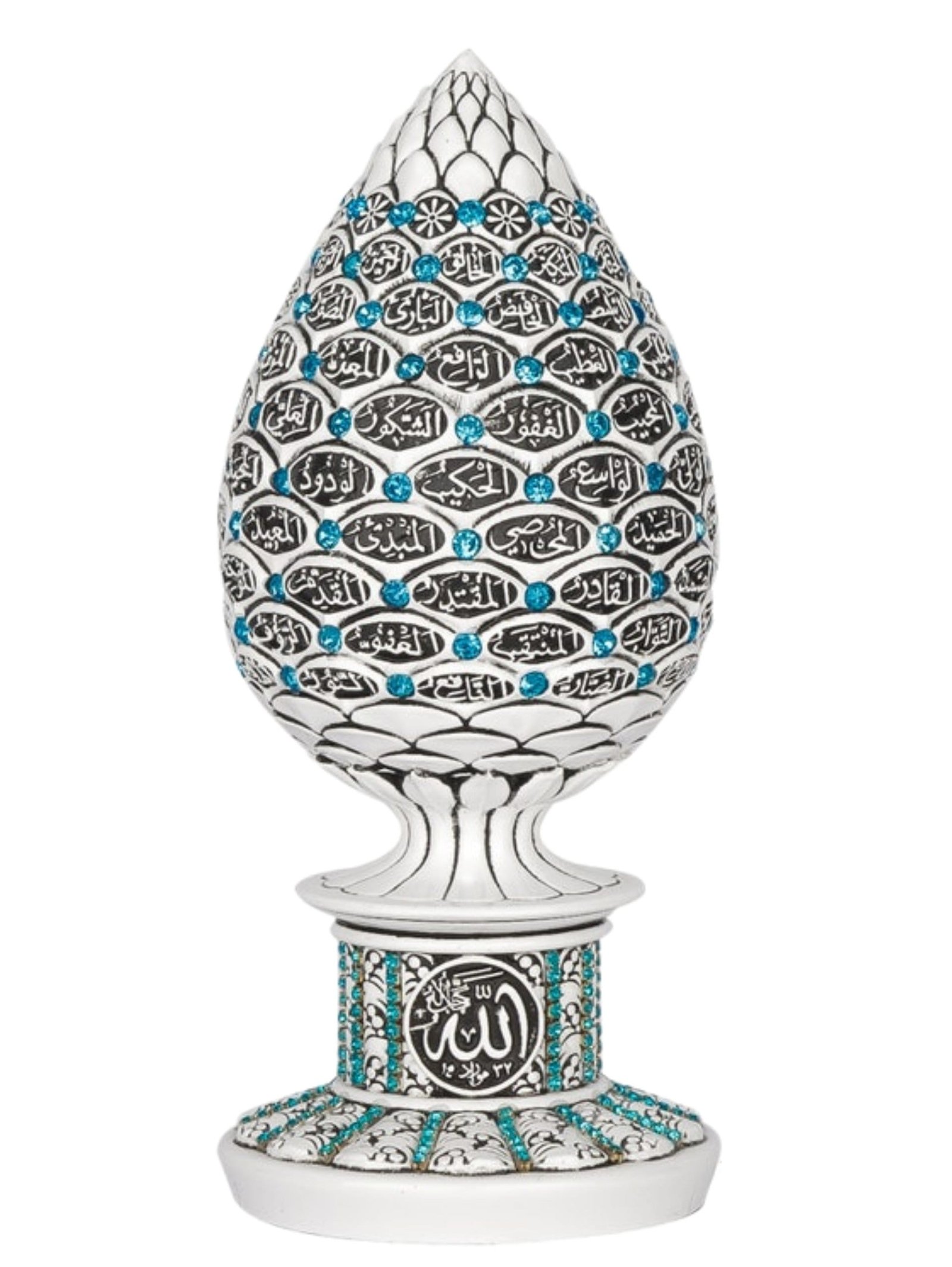 A beautiful white and blue cone sculpture engraved with the 99 names of Allah accented with crystal rhinestones