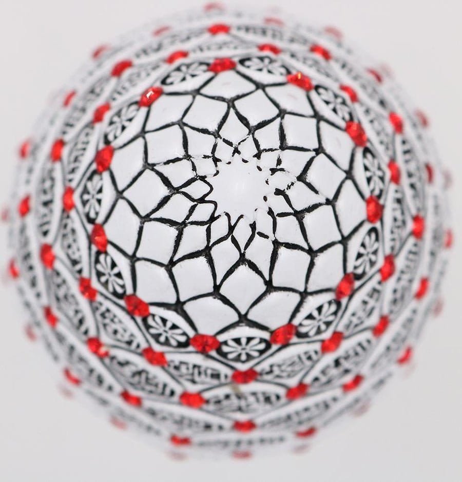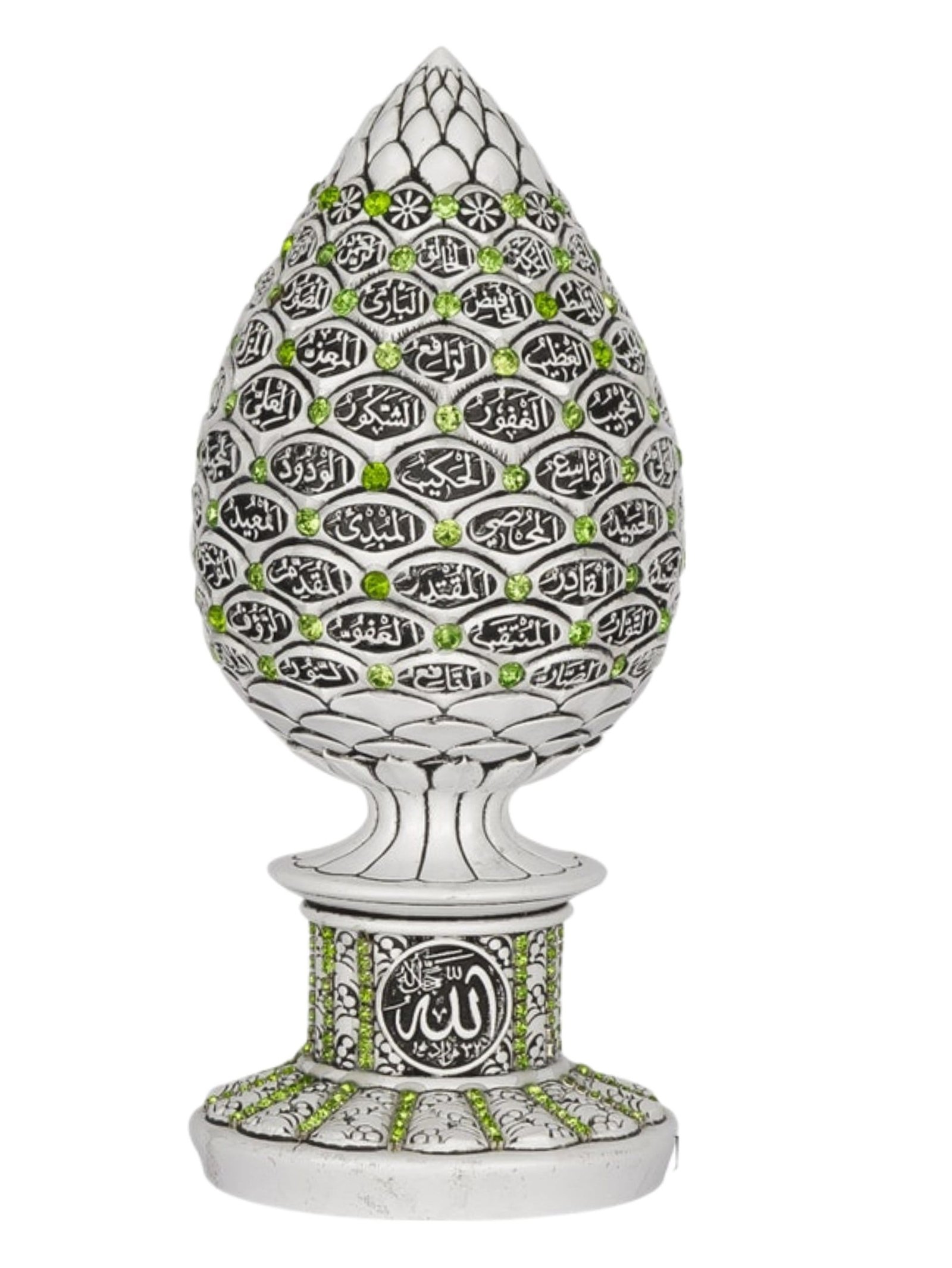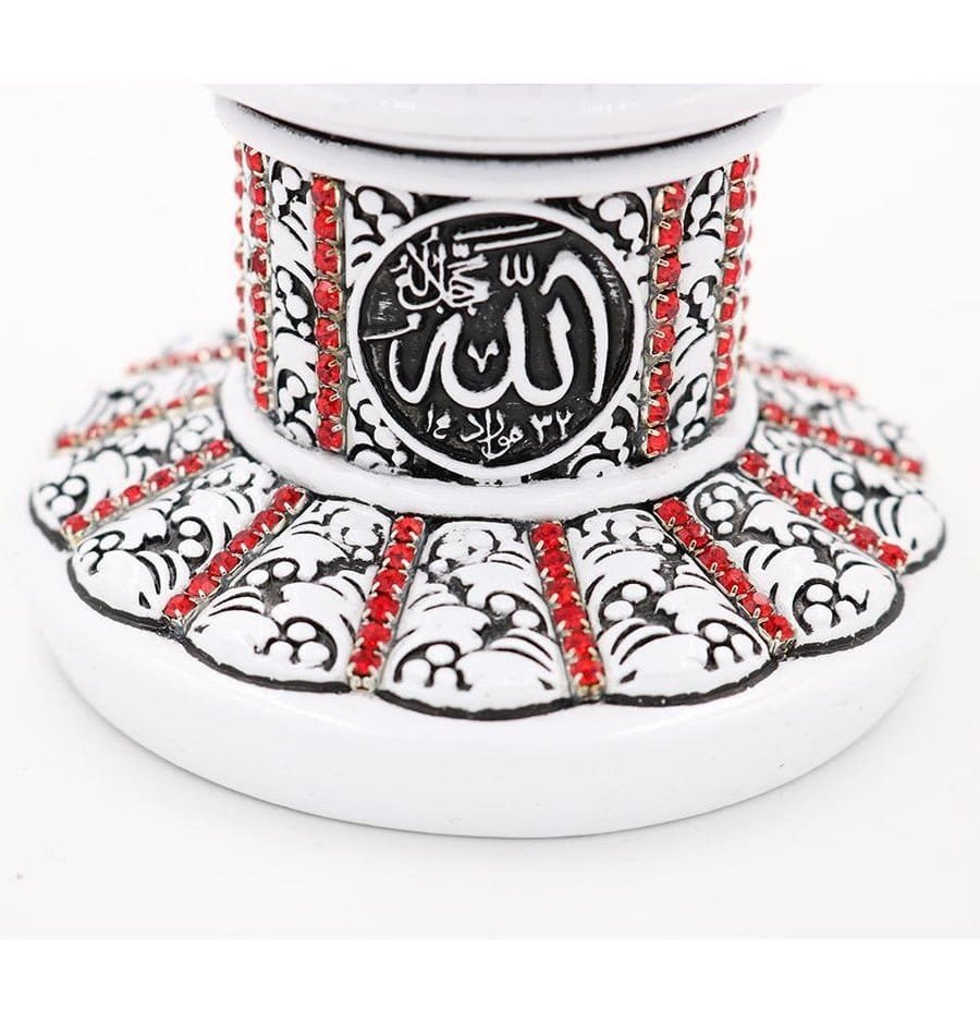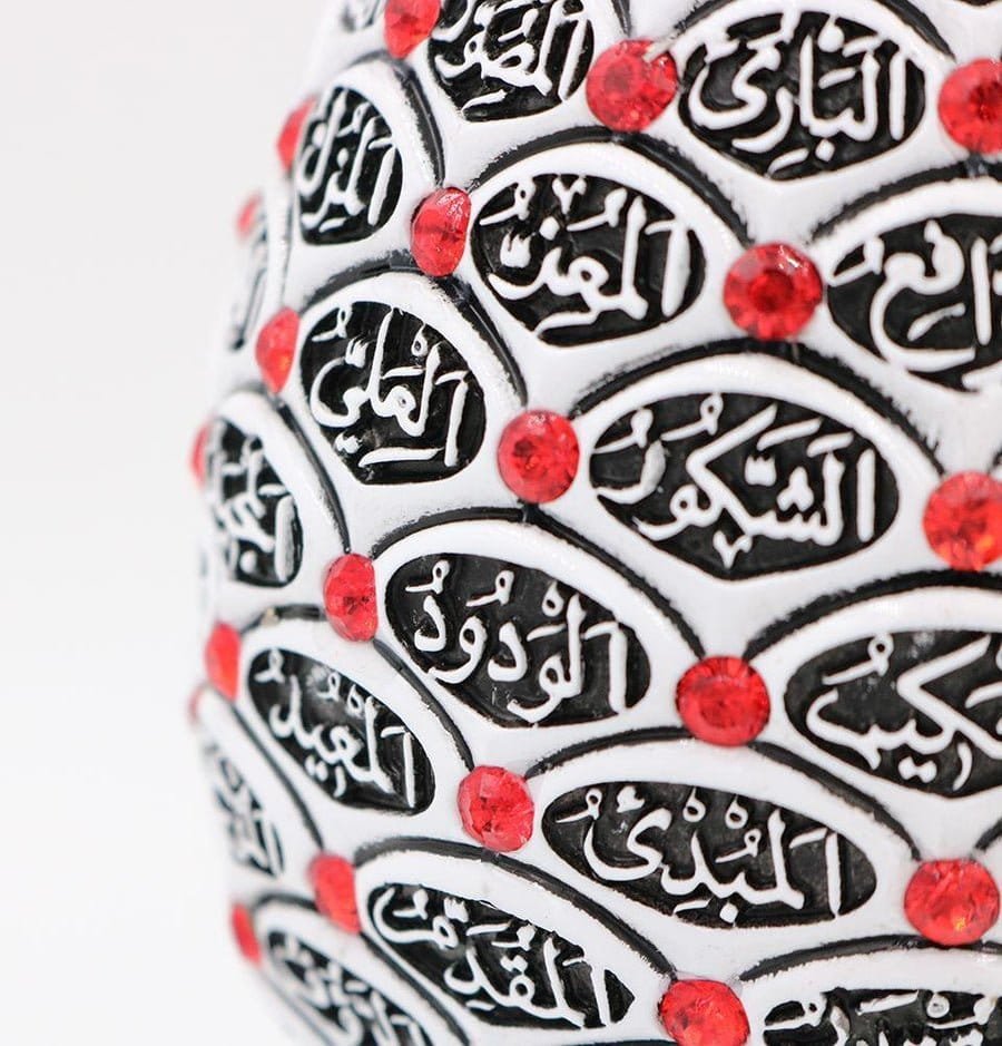 A beautiful white and blue cone sculpture engraved with the 99 names of Allah accented with crystal rhinestones