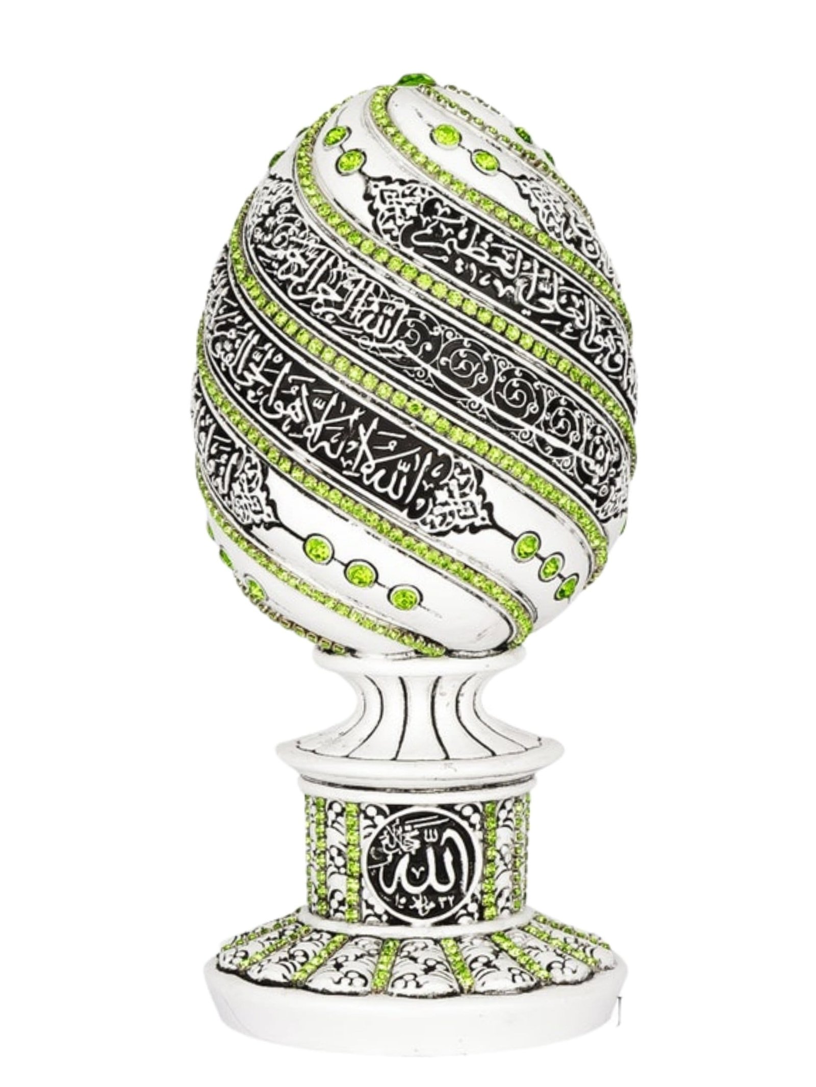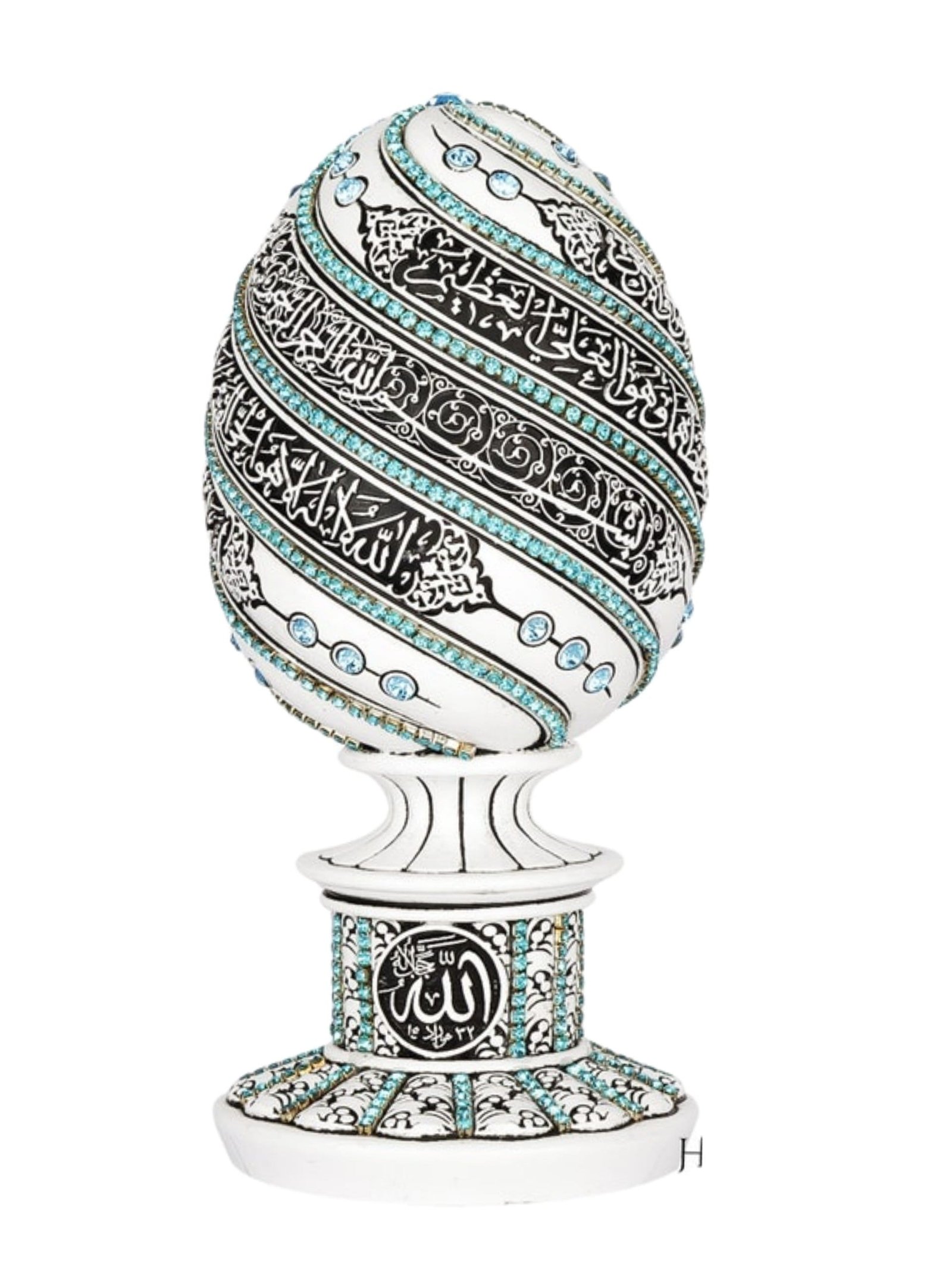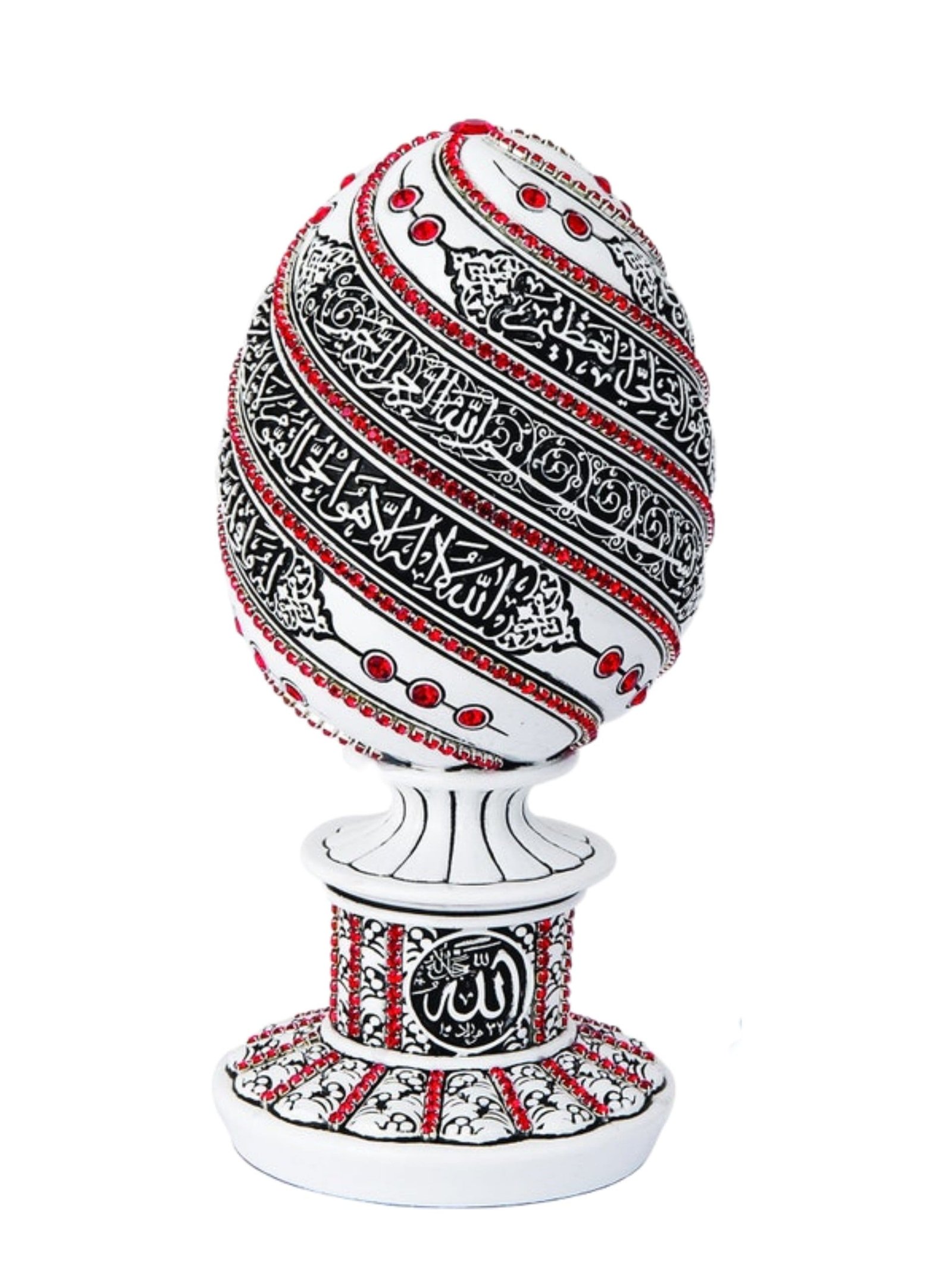 A beautiful white and red, blue, turquoise, or green egg sculpture engraved with Ayatul Kursi accented with crystal rhinestones