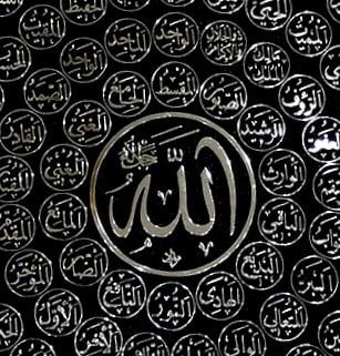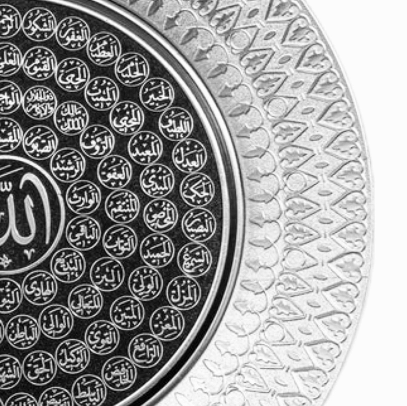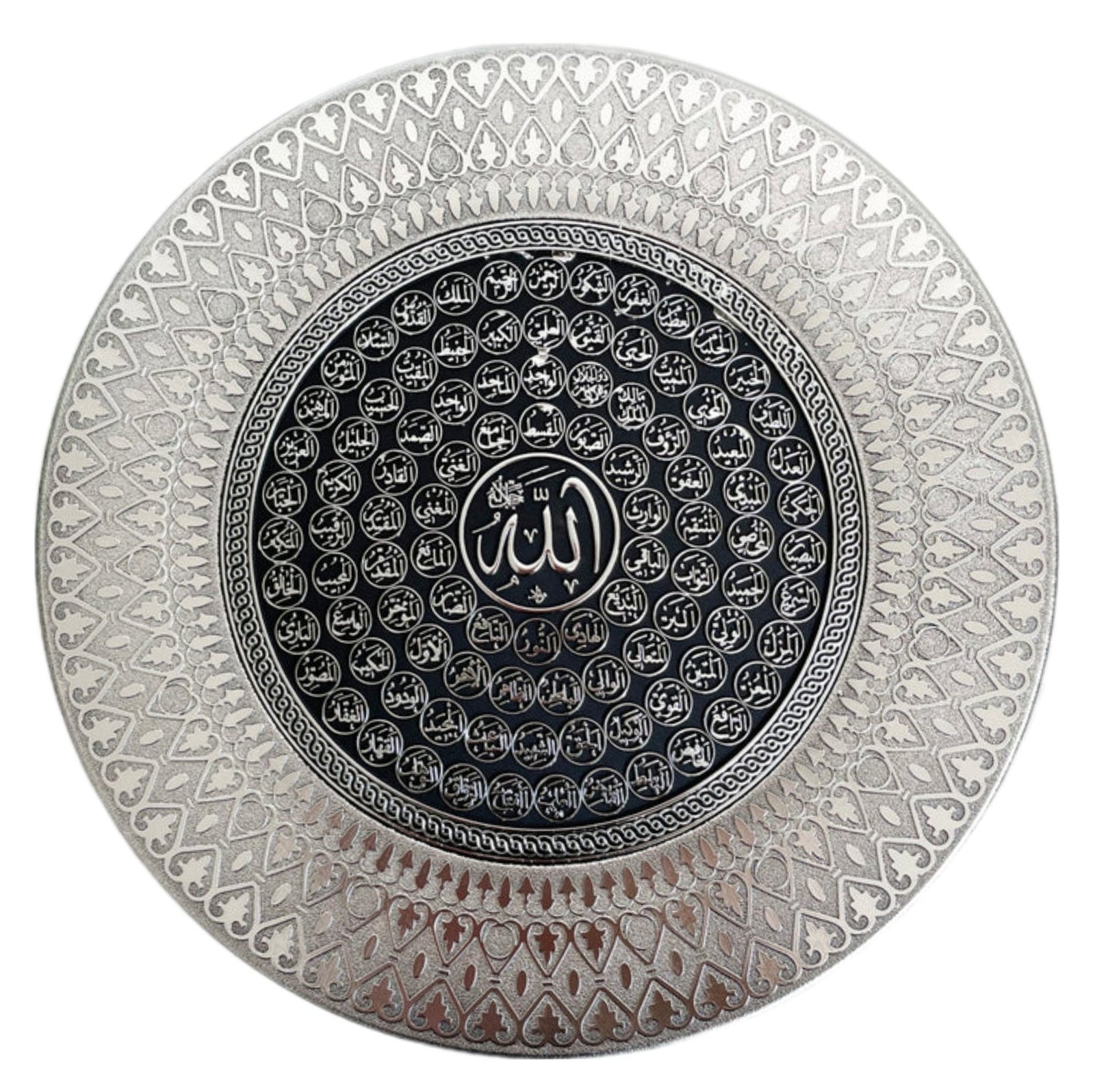 A beautiful golden cone sculpture engraved with the 99 names of Allah accented with crystal rhinestones Green, Red, Blue, Turquoise